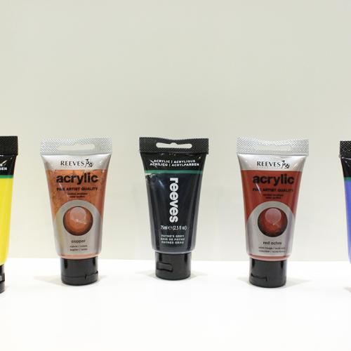 Reeves acrylic 75ml medium yellow, copper, paynes grey, red ochre dan cobalt blue